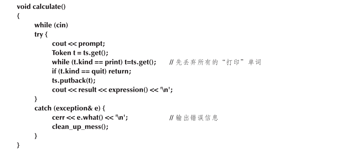 “清理遗留故障”的必要性何在?本质上来说,在错误处理之后准备好继续进行下面的运算,就意味着与错误相关的程序数据都已清理,所有数据都已处于良好的、可预测的状态。在计算器程序中,Token_stream是唯一在函数之外定义的数据。因此,我们所要做的就是清理与错误表达式相关的所有单词,避免它们弄乱下一个表达式。例如: