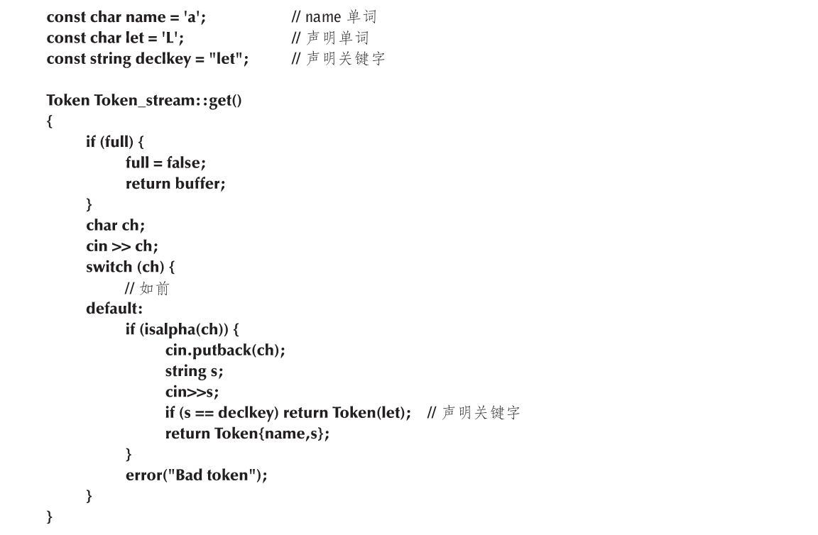 到现在为止,我们已经对程序进行了很好的改进,但很遗憾,它还不能正常运行。这并不意外,我们对程序下的“第一刀”通常是不会正常工作的,因为我们甚至还没有完成程序——程序还无法通过编译。程序还不能识别单词'=',但这可以通过在Token_stream::get()中添加一种情况处理来简单实现。但是对于单词let和name,必须修改get()函数来识别这些单词。一种实现如下: