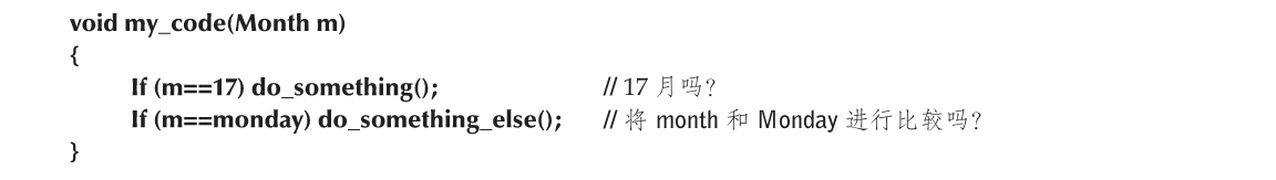 如果Month是enum class,两个if条件都不会被成功编译。如果monday是平坦枚举量(而不是作用域枚举量),那么month和Monday的比较是允许的,但很可能这会导致意外结果。