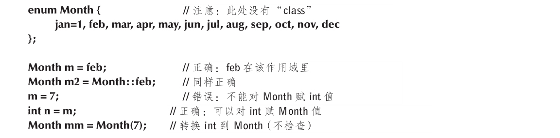 很明显,平坦枚举没有作用域枚举严格。平坦枚举的枚举量能“污染”枚举类型所在的作用域。有时候这很方便,有时也会导致混乱。例如,当你试图同时使用Month和iostream格式化机制(11.2.1节)时,会发现代表12月(December)的dec和代表十进制(decimal)的dec有冲突。