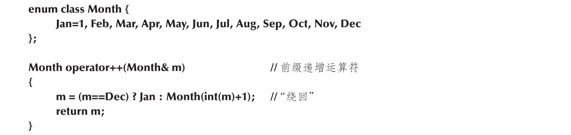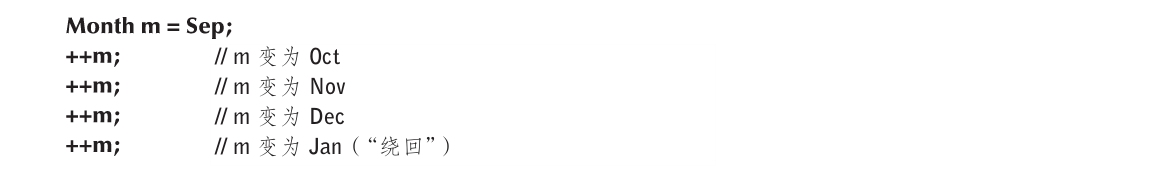 其中:是“算术if”运算符:当(m==Dec)时m的值变为Jan,否则m的值为Month(int(m)+1)。这是对十二月后继月份“绕回”一月这一特性的一种非常简洁的描述方法。现在,我们可以像如下代码一样使用Month类型: