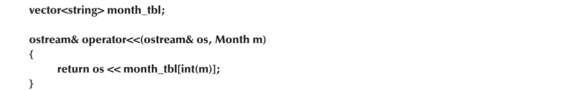 这里假定month_tbl已经在其他位置进行了初始化,每个数组元素保存了对应月份的恰当的名字,如month_tbl[int(Month::mar)]的值为字符串“March”或其他合适的名字;参见10.11.3节。