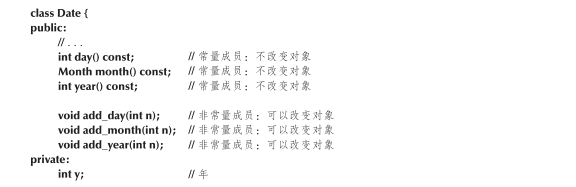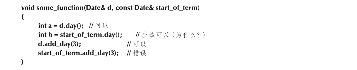 在这里,我们希望d是可变的,start_of_term是不可变的,而some_function()将不被允许对start_of_term进行更改。编译器是如何知道这些的呢?这是因为我们将start_of_term定义为const,从而使编译器获得了上述信息。好了,我们达到了预期的目的,但是,为什么用day()来读取start_of_term的成员day是被允许的呢?实际上,根据前面给出的Date的定义,start_of_term.day()是错误的,因为编译器不知道day()是否修改了对象的日期。我们没有给出过这方面的任何信息,因此编译器应该假定day()有可能改变日期,并报告一个错误。