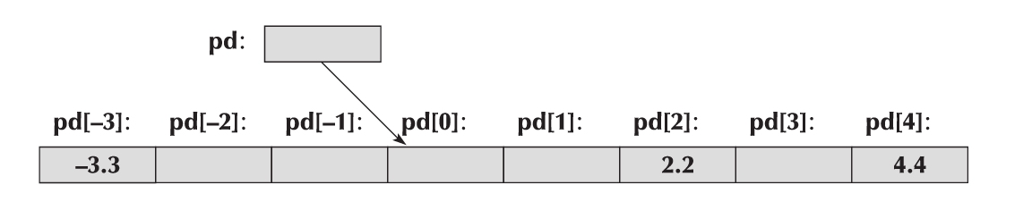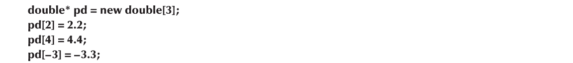 pd是否有第三个元素pd[2]?它是否有第五个元素pd[4]?如果查看pd的定义,我们发现答案分别是“是”和“否”。但是,编译器不知道这些;它并不跟踪指针的值。这段代码只是简单地访问内存,就像我们已经分配的足够的内存一样。它甚至会访问pd[-3],就像pd指向的地址往前三个double的位置也是我们分配的内存的一部分一样: