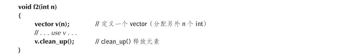 这段代码运行良好。但是,自由空间一个最常见的问题是人们会忘记delete。clean_up()也会产生同样问题,人们可能忘记调用它。我们可以做得更好。基本思路是令编译器知道一个可以做与构造函数相反事情的函数,就像它了解构造函数一样。必然地,这个函数被称为析构函数(destructor)。就像一个类对象创建时会隐式调用构造函数一样,当一个对象离开其作用域时会隐式调用析构函数。构造函数确保一个对象被正确创建并初始化。与之相反,析构函数确保一个对象销毁前被正确清理。例如: ...