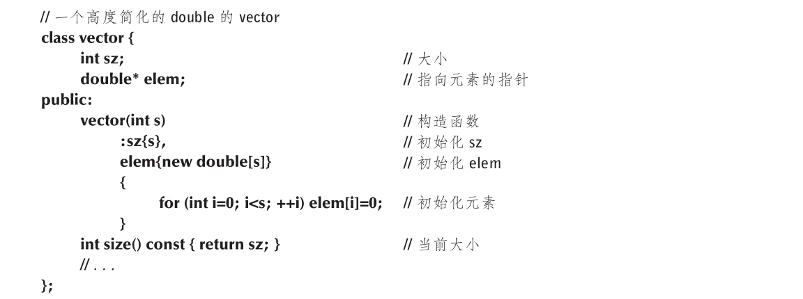 这样,sz就是元素的数量。我们在构造函数中初始化它,用户可以通过调用size()得到vector中的元素数量。在构造函数中使用new来分配元素空间,从自由空间返回的指针被保存在成员指针elem中。