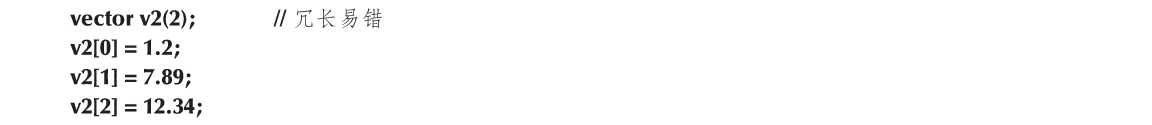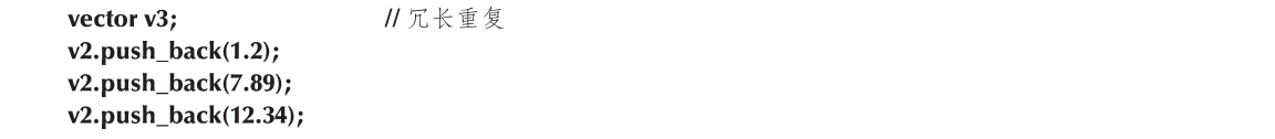 与v1的初始化相比,v2的初始化冗长易错(我们在这段代码中就故意将元素数量弄错了)。如使用push_back(),我们就不必提及vector的大小: