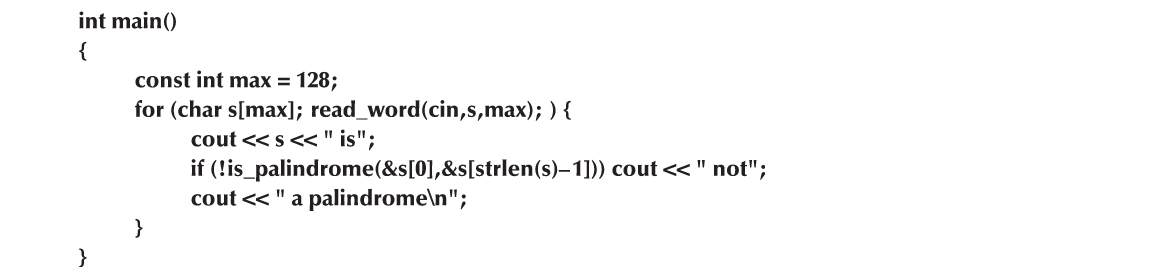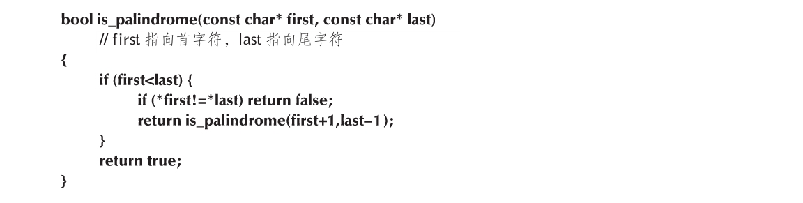 当我们重新描述回文的定义时,上述代码的意义就显而易见了:一个单词是回文的充要条件是,其首字符与尾字符相同,且删除首尾字符所得子串仍然是回文。