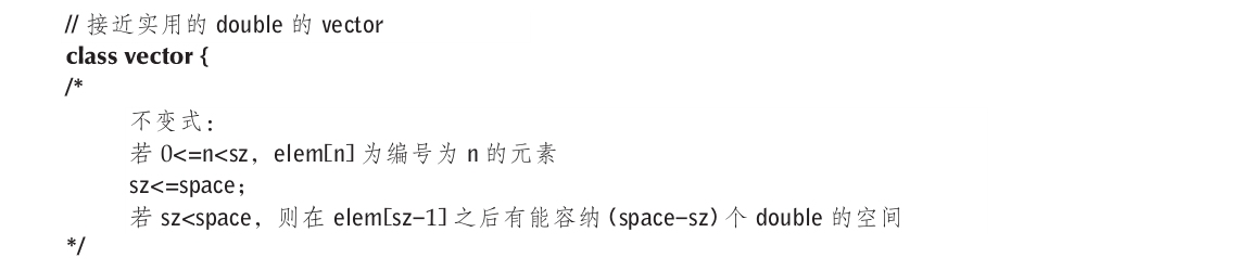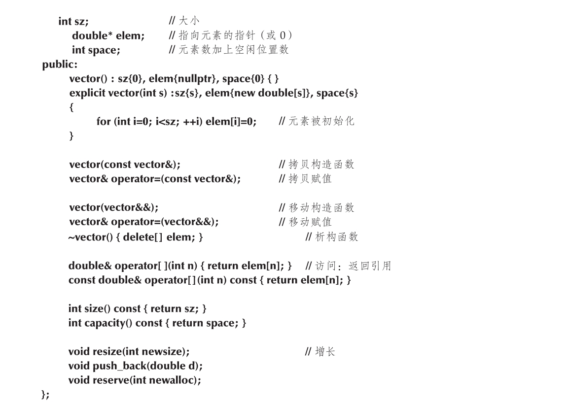 请注意上述代码是如何实现那些必要操作的(见13.4节):构造函数、默认构造函数、拷贝操作、析构函数。此vector实现了元素访问操作(下标[]),实现了获取数据信息的操作(size()与capacity()),还实现了控制大小变化的操作(resize()、push_back()和reserve())。