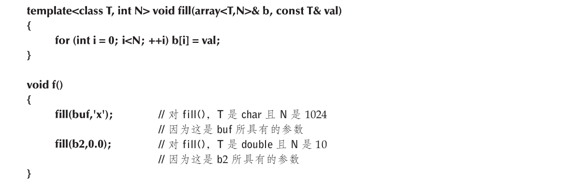 在技术上,fill(buf,'x')是fill<char,1024>(buf,'x')的简写,fill(b2,0)是fill<double,10>(b2,0)的简写。幸运的是,我们通常并不需要编写这么具体的代码。编译器能够为我们做这些事情。