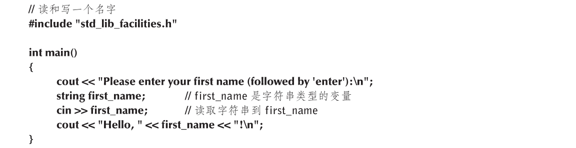 main()中的第一行简单地输出一条信息,提示用户输入一个名字。这个信息通常被称为一个提示信息,这是由于它提示用户完成某个操作。接下来几行定义了一个名为first_name的string变量,读入键盘输入到该变量,并输出一个欢迎词。让我们依次来看这三行: ...
