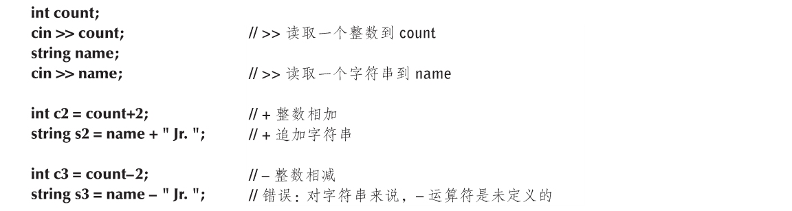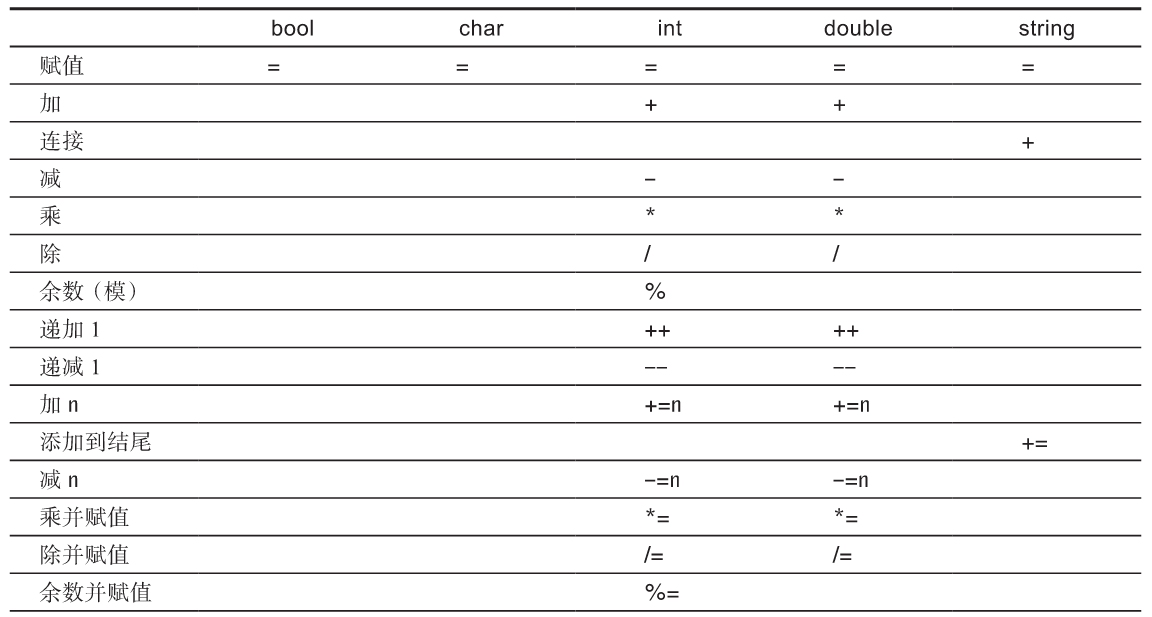 表中的空格表示一个运算符不能直接用于一种类型(尽管可能有间接使用这种运算符的方式,见3.9.1节)。我们将在后面的内容中解释这些及更多的运算符。这里的关键点是有很多有用的运算符,而且它们表示的意义对相似的类型通常是一样的。 ...