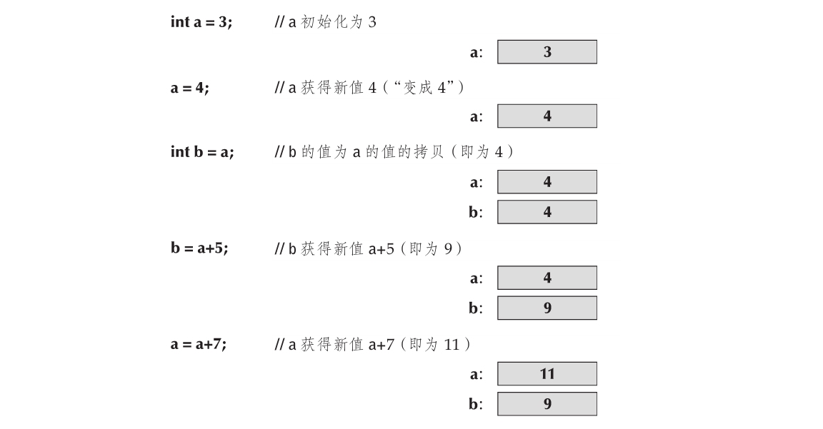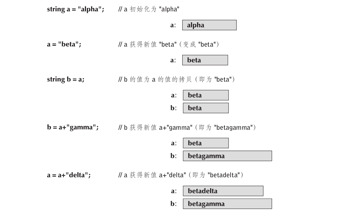 但是,赋值和初始化在逻辑上是不同的。你可以通过类型说明(int或string)来区分它们,它们总是从初始化开始;赋值并不需要这样做。从原则上来说,初始化时变量为空。另一方面,赋值在放入一个新的值之前,首先必须将旧的值清空。你可以将变量看作是一种小的盒子,值是一个可以放入其中的具体东西(例如一枚硬币)。在初始化之前盒子是空的,但是在初始化之后它总是包含一枚硬币,以便在里面放入一枚新的硬币。你(赋值操作符)首先需要移走旧的东西(“销毁旧的值”),你不能使盒子是空的。在计算机内存中并不完全如字面上所说,但是它对于我们理解后面的内容没有坏处。 ...