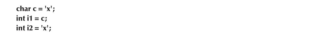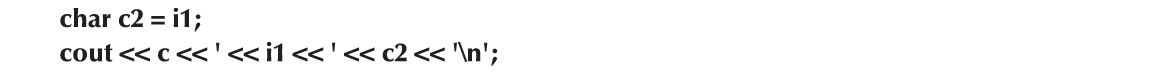 这里的i1和i2都被赋值为120,它是字符'x'在最流行的8比特字符集ASCII中的整型值。这是一个简单和安全的方法,通过它可以获得一个字符的数字表示。我们称这种char-int的转换为安全的,这是由于没有信息丢失;也就是说,我们可以将int结果拷贝回一个char中,并且得到原始的值: