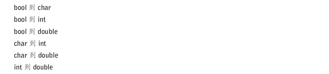 在3.4节中,我们发现不能直接对char进行相加,或者将一个double与一个int比较。但是,C++提供了间接方式来完成这些操作。在有必要时,一个char可以转换成一个int,而一个int也可以转换成一个double。例如: