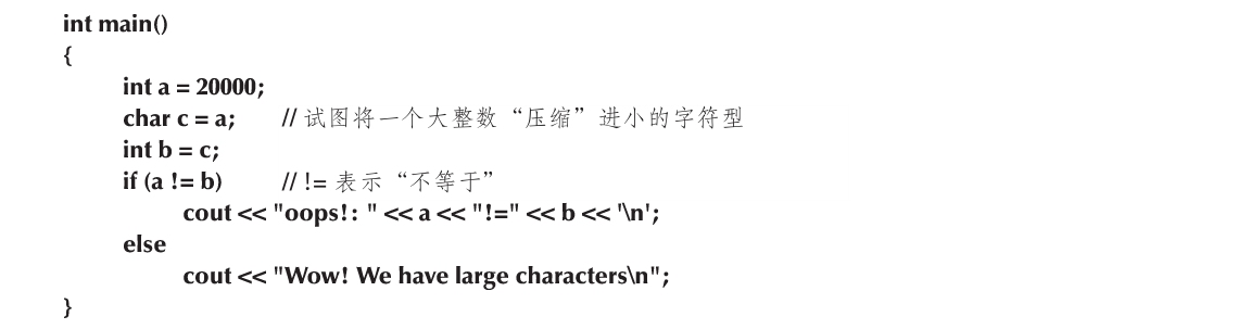 这种转换又被称为“窄化”转换,这是由于它们将一个值放入一个对象,这个对象可能太小(“狭窄”)以至于不能存放这个值。不幸的是,只有少数编译器会警告将char初始化为int的不安全。这里的问题是一个int通常比一个char大,因此(在这种情况下)它可以保存一个并不能表示char的int值。尝试执行这个程序,查看你计算机中的值b(常见的结果是32);更进一步,完成实验: