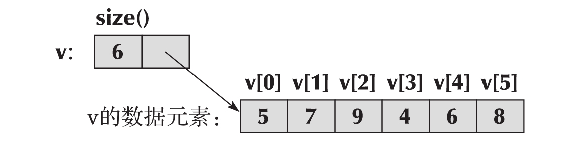 其中,第一个数据元素的索引号是0,第二个是1,依此类推。我们可以用vector名和索引号的组合来表示一个具体的数据元素,例如v[0]是5,v[1]是7,依此类推。vector的索引号总是从0开始,每次加1。看上去有些熟悉,实际上vector是C++标准库函数中一个历史久远的著名库函数实现的简化版本。图中特别强调了vectorv“知道自己的大小”,即vector不仅存储数据元素,也存储元素的个数。