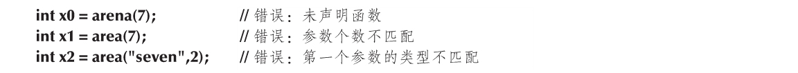 2.对于area(7),编译器检查到错误是参数个数不匹配。对于C++语言,函数调用必须使用正确的参数个数、参数类型和顺序。在合理使用类型检查系统时候,它可以作为实时的错误检查工具(详见19.1节)。
