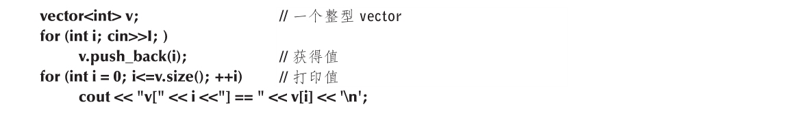 不幸的是,我们犯了一个错误。仔细看看for循环:它的终止条件是i<=v.size()而不是i<v.size()。这会导致一个不幸的结果:如果我们读入了5个整数,它会试图输出6个结果。因为我们试图读v[5]的值,而它已经超出了vector的存储空间范围。这类错误是非常普遍的而且很“出名”,人们为它起了很多名字:偏一位错误(off-by-one ...