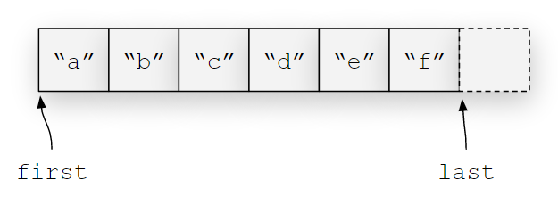 auto vec=std::vector<std::string>{ "a","b","c","d","e","f"};auto first = vec.begin();auto last = vec.end(); |