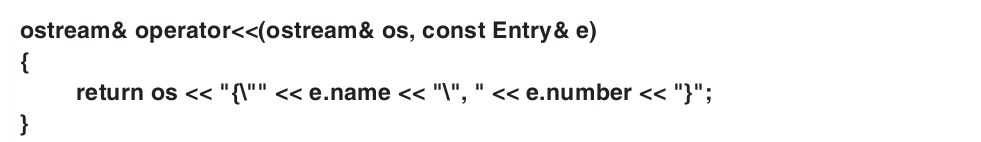 我们可以定义一个简单的输出运算符,以类似初始化代码的形式{"name",number}来打印一个Entry: