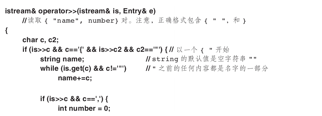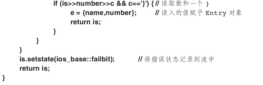 is>>c默认跳过空白符,而is.get(c)不会,因此,上面的Entry的输入运算符忽略(跳过)名字字符串外围的空白符,但不会忽略其内部的空白符。例如: ...