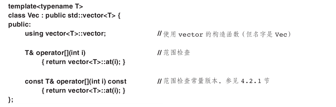 Vec继承了vector除下标运算符之外的所有内容,它重定义了下标运算符来进行范围检查。vector的at()操作也完成下标操作,但它会在参数越界时抛出一个类型为out_of_range的异常(参见3.5.1节)。