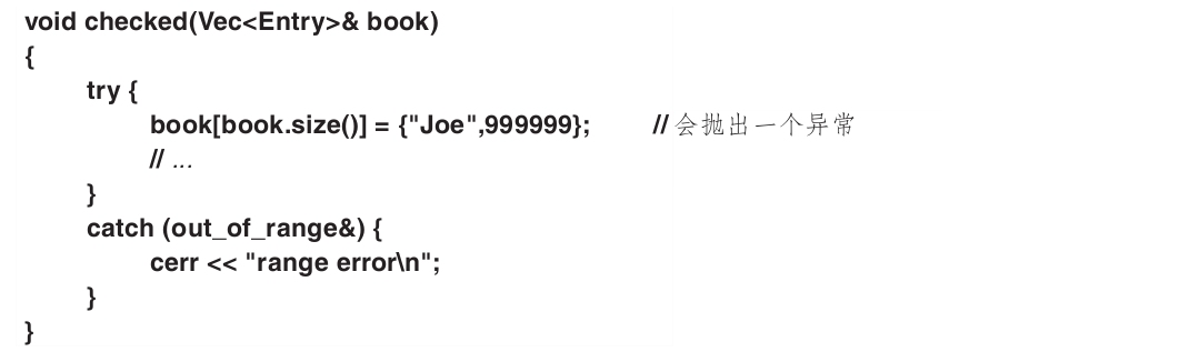 这段程序会抛出一个异常,然后将其捕获(参见3.5.1节)。如果用户不捕获异常,程序会以一种明确定义的方式退出,而不是继续执行或是以一种未定义的方式失败。一种尽量减小未捕获异常带来的问题的方法是使用以try块作为main()函数的函数体。例如:
