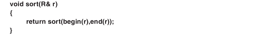 Range概念令我们可以使用sort(v)而不是sort(v.begin(),v.end()),后者是自1994年以来我们使用STL不得不采用的语法。例如: