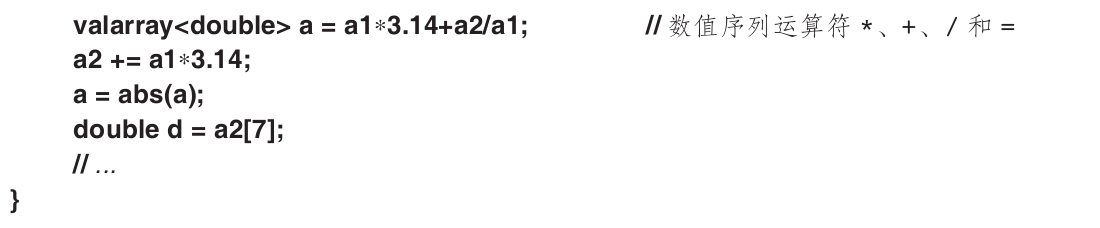 11.2节介绍的vector被设计成一种通用的保存值的机制,它足够灵活,也能够适应容器、迭代器和算法的架构。但它不支持数学上的向量运算。为vector提供这类运算并不难,但它的泛化能力和灵活性妨碍了性能优化,而这通常是重要数值计算任务所必需的。因此,标准库在<valarray>中提供了一个类似于vector的模板valarray,其通用性较弱,但针对数值计算进行了必要的优化: