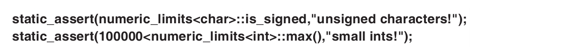 在<limits>中,标准库提供了描述内置类型属性的类,比如float的最高阶以及int所占的字节数等。举个例子,我们可以断言char是带符号的类型: