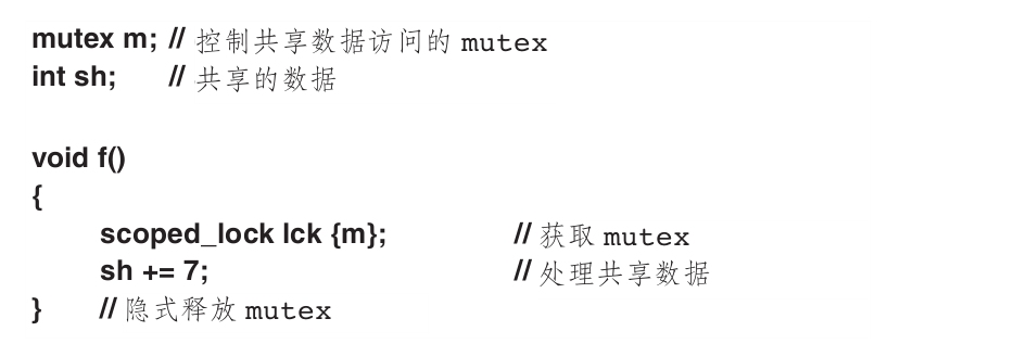 注意RAII(参见5.3节)的使用。使用scoped_lock和unique_lock(参见15.6节)这样的资源句柄比显式对mutex加锁、解锁要更简单且更安全。