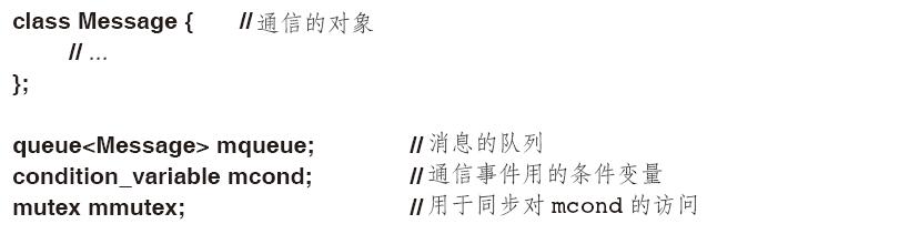 condition_variable支持很多优雅而高效的共享方式,但也有可能相当复杂。考虑两个thread通过一个queue传递消息来通信的经典例子。简单起见,我声明queue对象以及生产者、消费者共享queue同时避免竞争条件的机制如下: