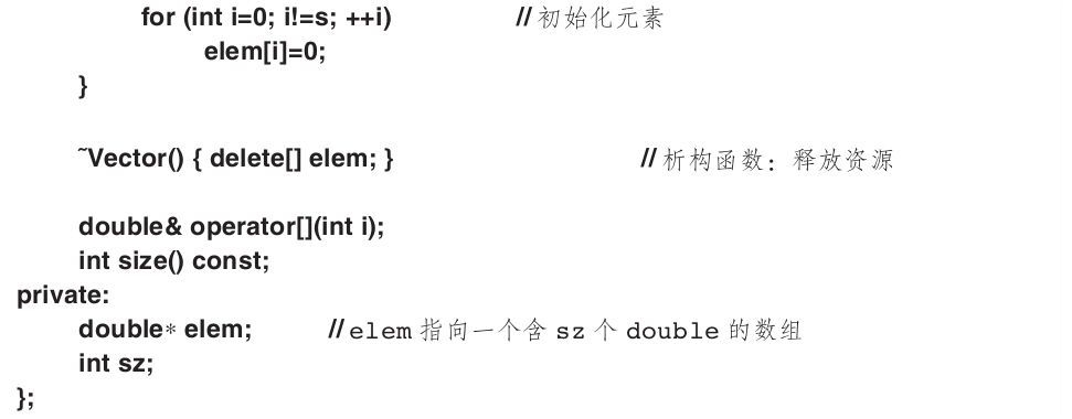 容器(container)是包含若干元素的对象。因为Vector类型的对象都是容器,所以我们称类Vector是一种容器类型。如2.3节中的定义,Vector是一种很不错的double容器:它易于理解,建立了一个有用的不变式(参见3.5.2节),提供了带边界检查的访问(参见3.5.1节)并且提供了size()令我们可以遍历其元素。然而,它还是存在一个致命的缺陷:它使用new分配了元素,但从没有释放这些元素。这不是一个好的设计,因为尽管C++定义了一个垃圾回收器的接口(参见5.3节),但并不保证它总是可用的以将未用内存提供给新对象。在某些情况下,你不能使用回收器,而且通常出于逻辑或性能的考虑,你更想使用精确的回收控制。因此,我们需要一种机制以确保构造函数分配的内存一定会被释放,这种机制就叫作析构函数(destructor):