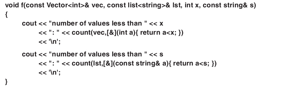 [&](int a){return a<x;}这种表示方法被称为lambda表达式(lambda expression),它生成一个与Less_than<int>{x}完全一样的函数对象。[&]是一个捕获列表(capture list),它指出lambda体中使用的所有局部名字(如x)将通过引用访问。如果希望只“捕获”x,则可以写成[&x];如果希望给生成的函数对象传递一个x的拷贝,则写成[=x]。什么也不捕获是[],捕获所有通过引用访问的局部名字是[&],捕获所有以值访问的局部名字是[=]。