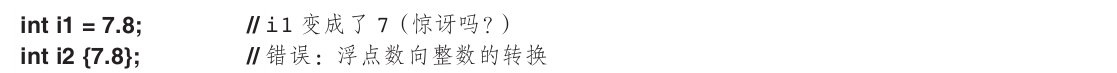 不幸的是,丢失信息的类型转换,即收缩转换(narrowing conversion),如double转换为int及int转换为char,在C++中是允许的,而且是隐式应用的。隐式收缩转换带来的问题是为了与C语言兼容而付出的代价(参见16.3节)。
