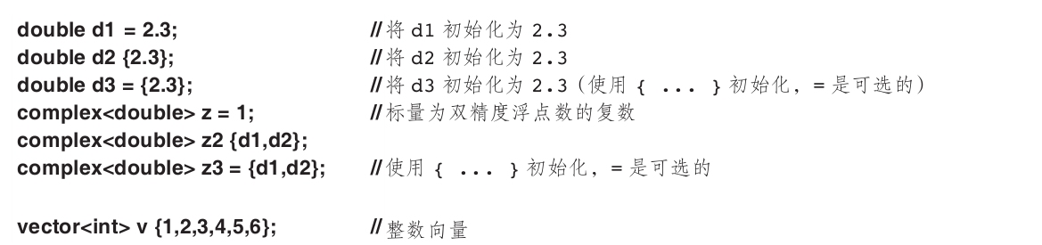 在使用对象之前,必须给它赋予一个值。C++提供了多种表达初始化的符号,如前面用到的=,以及一种更通用的形式——花括号限界的初始值列表: