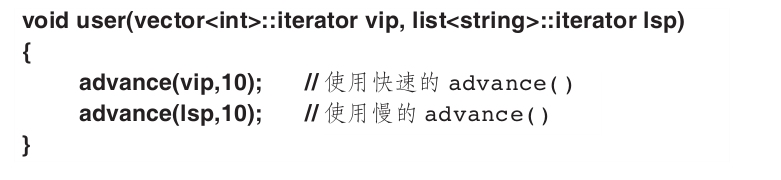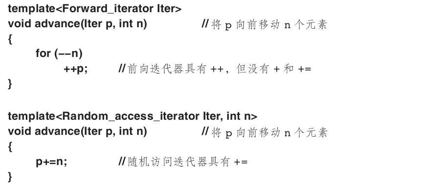 一旦已经恰当地用接口说明了模板,那么可以基于其属性来进行重载,这和函数几乎一样。考虑标准库函数advance()(参见12.3节)的一个略微简化的版本,它向前推进迭代器:
