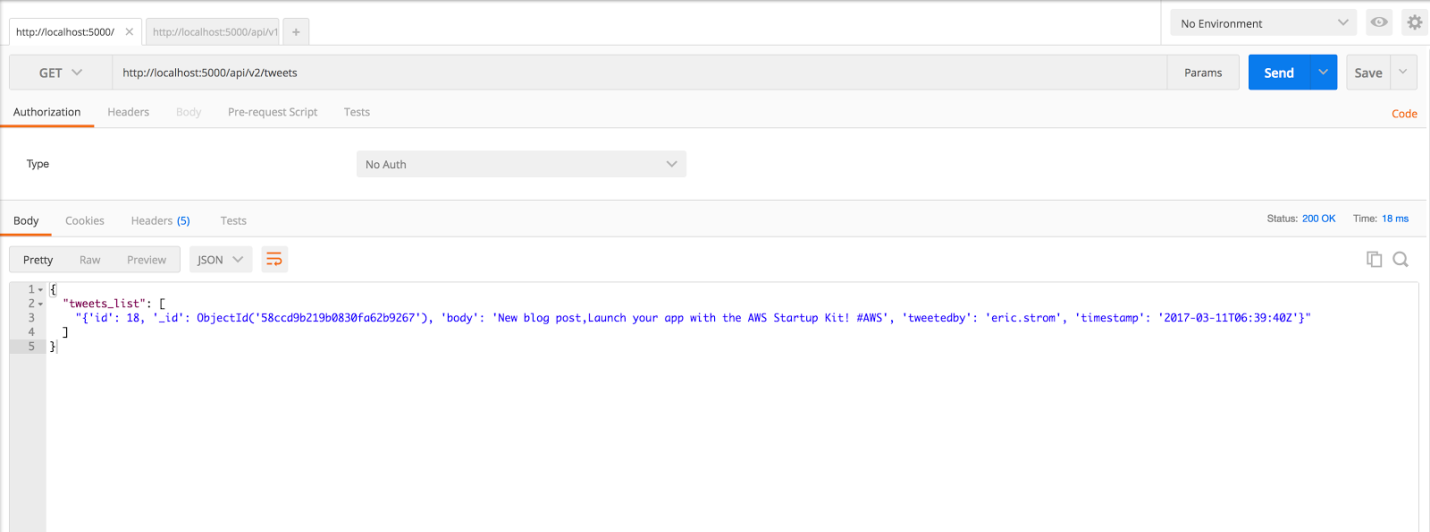 Now that we have updated the code, let's test it out on POSTMAN. The following screenshot lists all the tweets by making an API request using POSTMAN: