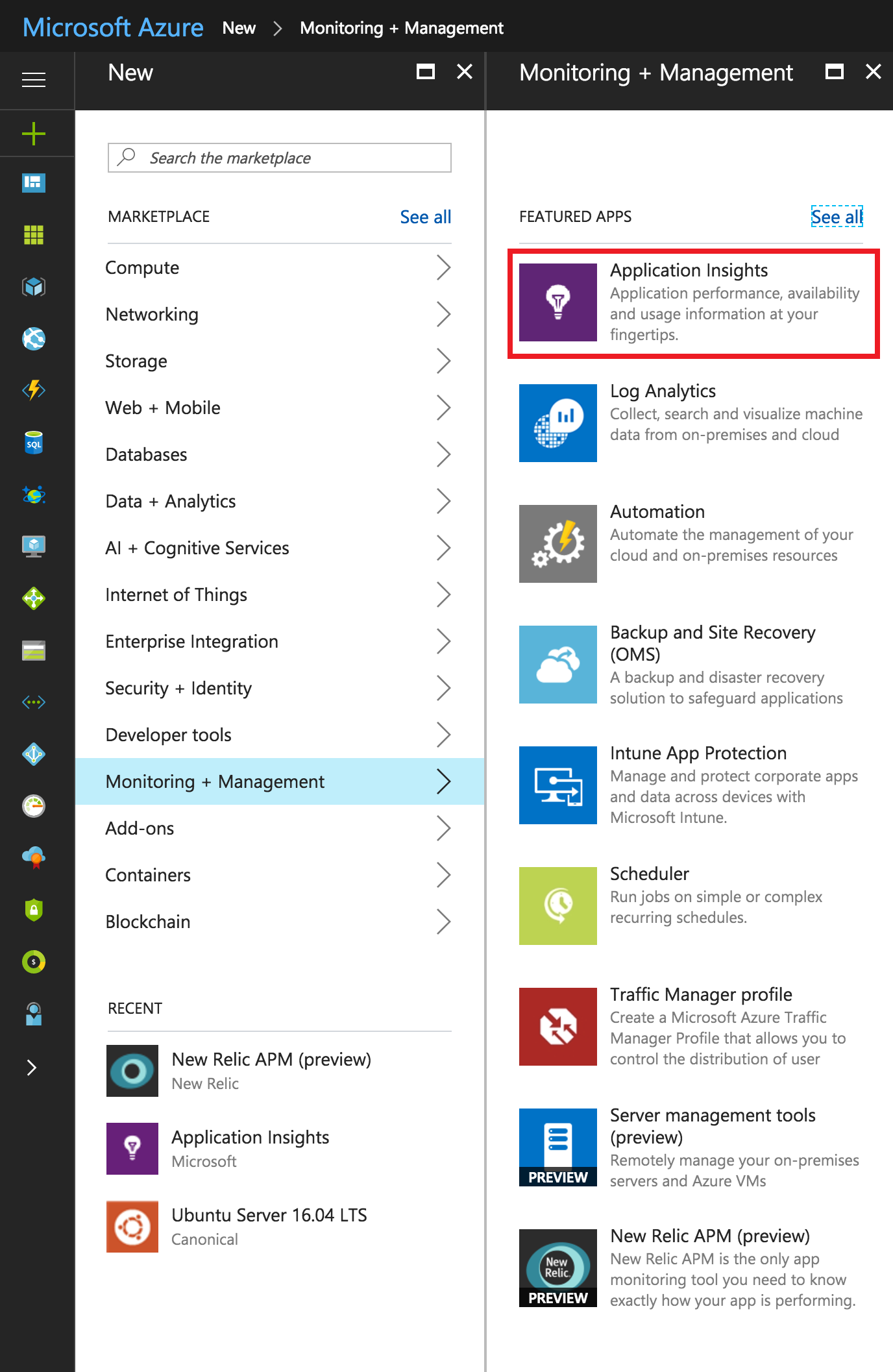 In order to set up Application Insights, all you need to know is the application and group name in which your infrastructure lies. Now, if you click on the + Sign on the left pane, you should see a screen similar to the following screenshot: