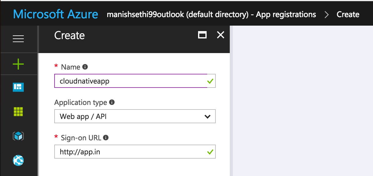 Now we need to register our application, so, select the App registrations link in the left pane. You will see a screen similar to the next one, where you need to provide your application details: