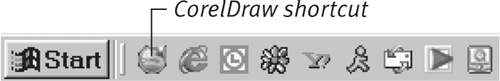 Double-click a CorelDraw 10 shortcut that you've placed on the Windows desktop, in a folder, or in the Quick Launch toolbar (Figure 2.1). Depending on how you've configured Windows, you'll either need to double-click or click the shortcut.
