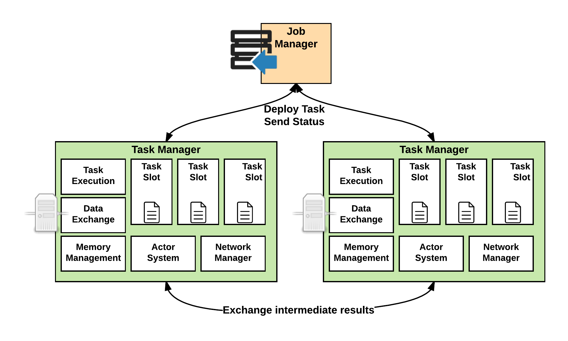 The following figure shows the anatomy of the Task Manager. It shows multiple workers task nodes showing that this component is usually more than one in a typical deployment: