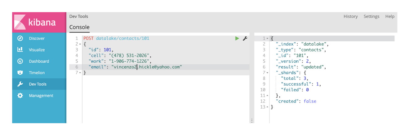 Now let's try and update the same document with a change in the email address. The update command has a form of POST {index-name}/{type}/{id} and the request body as shown here: