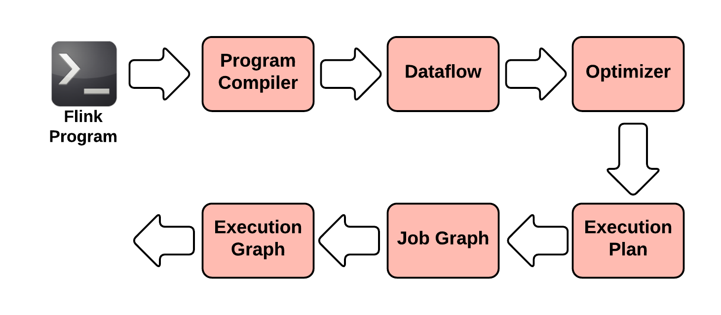 The following figure shows Flink’s execution model. The Flink program written is parsed by the program compiler and then type extracted and then optimized (Flink Optimizer). Each submitted job is then converted to a dataflow graph and then passed onto Job Manager, which then creates an execution plan and the job graph is then passed onto Task Manager where the tasks are finally executed (execution graph).