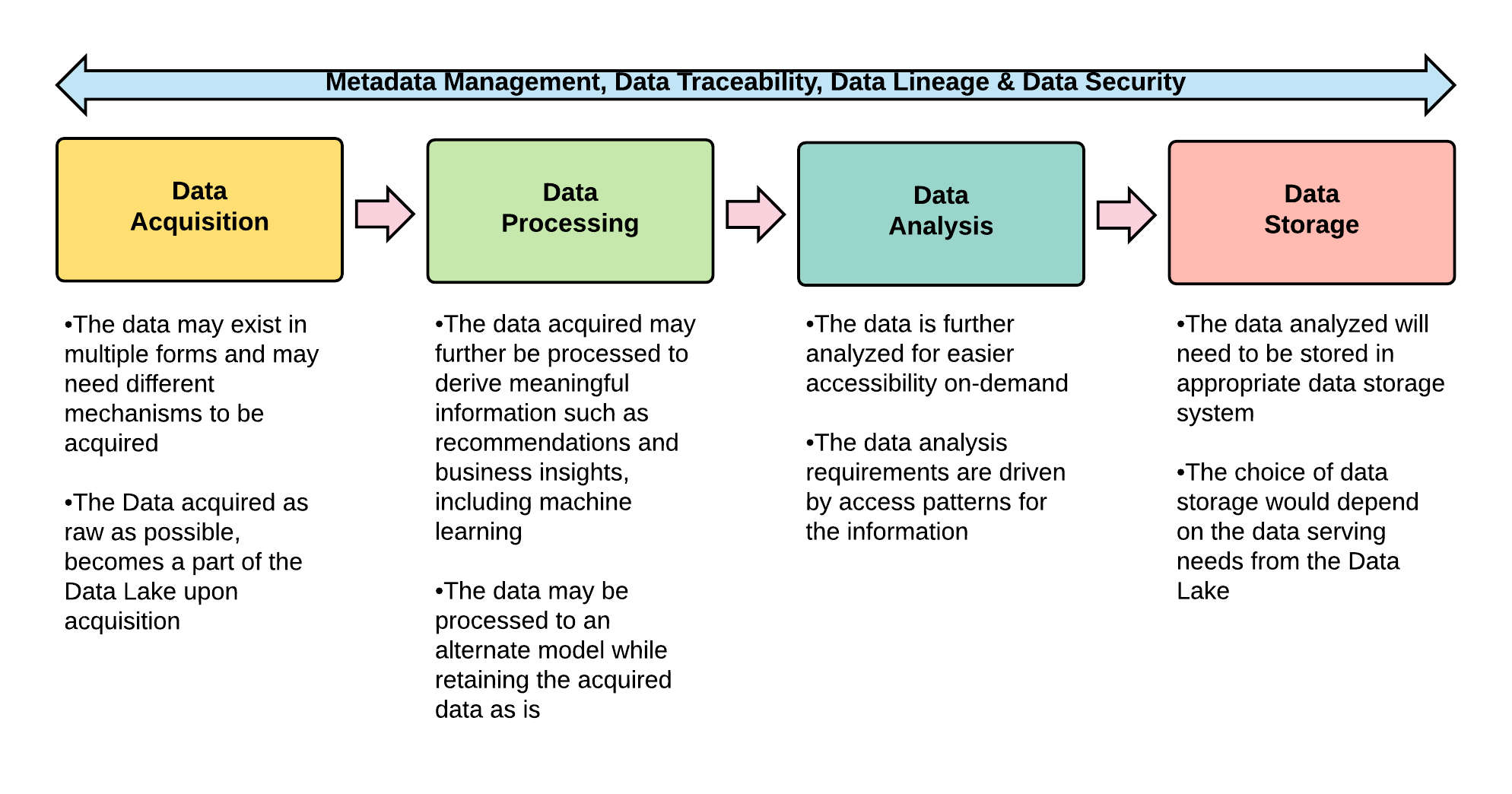 These can also be called various stages of data as it lives within the Data Lake. The data thus acquired can be processed and analyzed in various ways. The processing and data analysis could be a batch ...