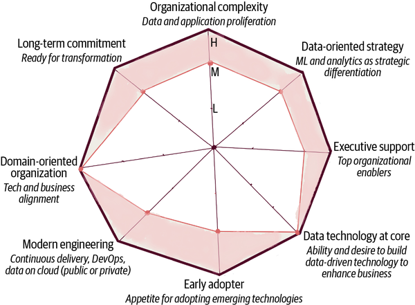 Figure 15-1 depicts my perspective on these questions. I suggest that organizations that fall in the colored section of the spider graph—scoring medium or high on each of the assessment axes—are best positioned to adopt data mesh successfully at this point in time. You can use the following criteria to self-assess whether data mesh is the right choice for your organization now.