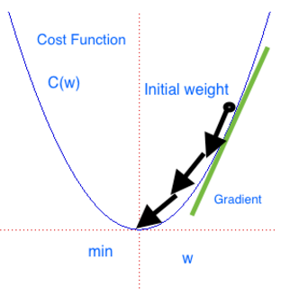 The gradient descent can be seen as a hiker who aims at climbing down a mountain into a valley. The mountain represents the function C, while the valley represents the minimum Cmin. The hiker has a starting point w0. The hiker moves little by little. At each step r, the gradient is the direction of maximum increase. Mathematically, ...