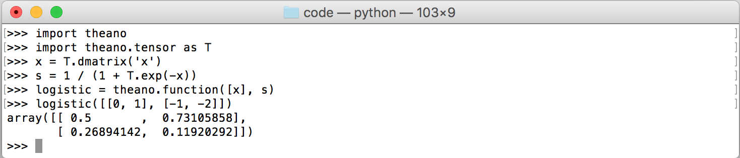 Now let's test the environment. First let's look at how to define the sigmoid function in Theano. As you see, it is very simple; we just write the mathematical formula and compute the function element-wise on a matrix. Just run the Python Shell and write the code as shown in the following screenshot to get the result: