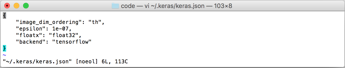 Keras has a very minimalist configuration file. Let's load it with a vi session. The parameters are very simple: